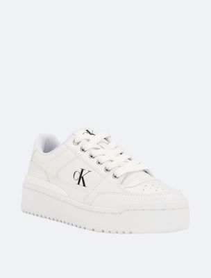 Designed with a retro-inspired silhouette, these sneakers feature a low-top, platform design with a round toe. Made with lace-up styling and topstitching details, capturing an athletic look. Finished with a CK monogram logo at the side. Material: Faux Leather Upper.