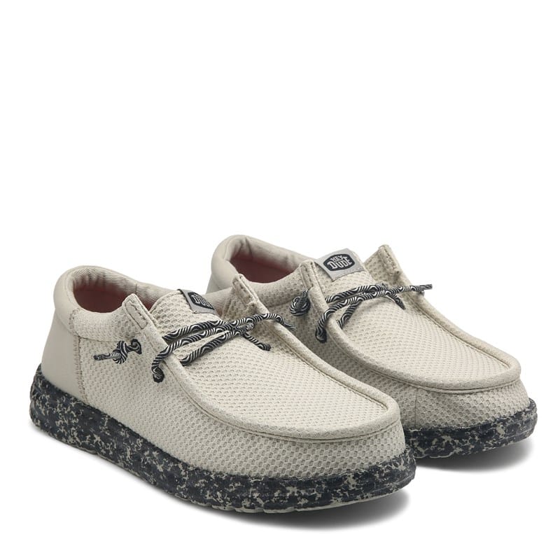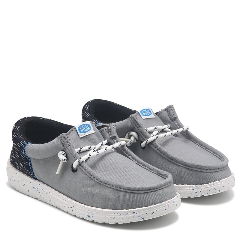 The Kids' HEYDUDE Wally Slip On is the perfect footwear for spirited play Iconic low-top moc. No-tie laces for easy slip on entrance. Removable memory-foam insole. Ultralight outsole. Machine washable (cold) Air dry(Excluding wool suede leather corduroy and faux fur). Sizing tip: If you're in between sizes we suggest choosing the next size up for best fit. Hey you. The HEYDUDE logo recently got a little update. Some of our shoes may still have the original one but we promise they're equally as comfortable.