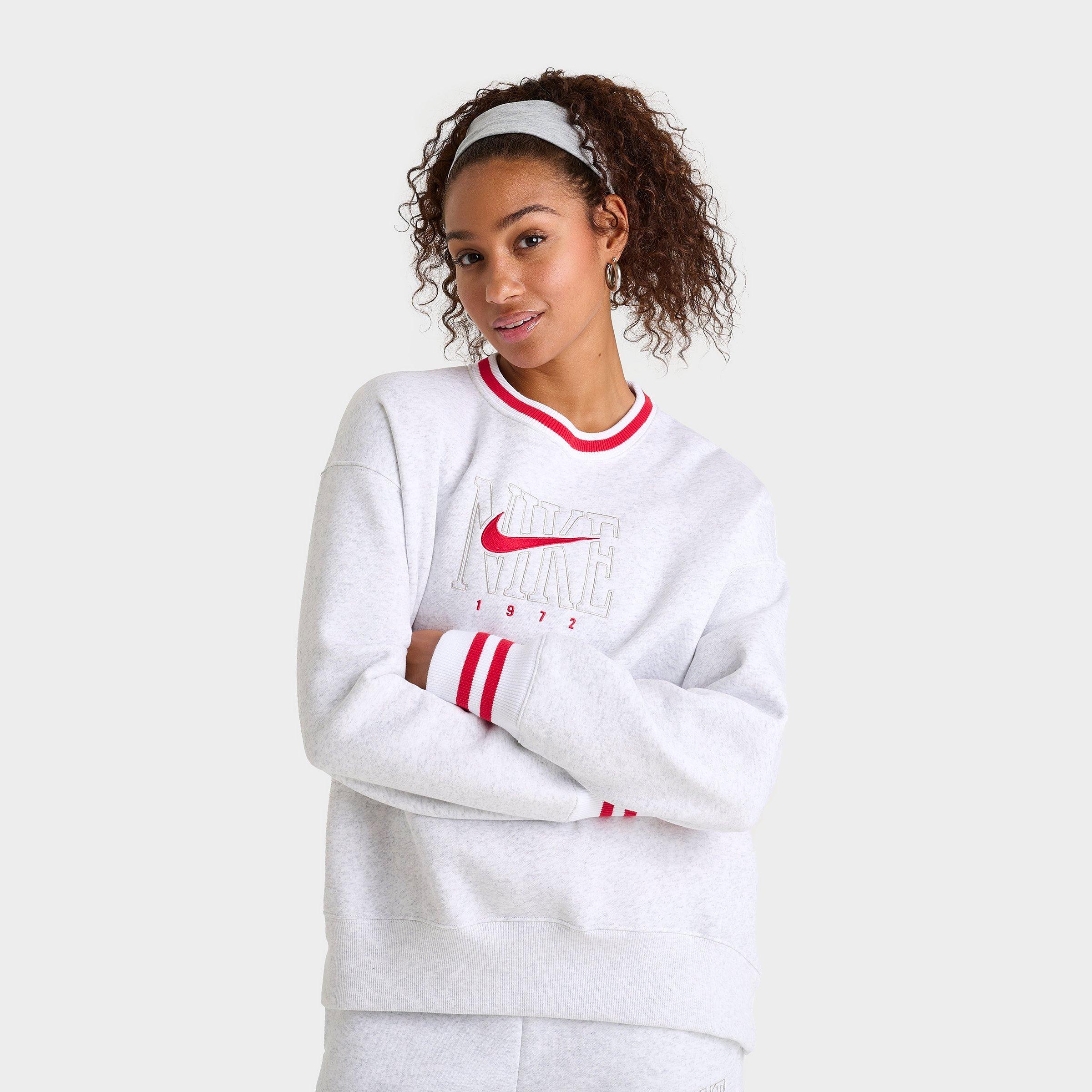 Size & Fit Roomy, relaxed fit Dropped shoulder design Product Features Supersoft, oversized active lifestyle sweatshirt with 1972 Nike Sportswear branding embroidered at center chest and back High-contrast 2-color striped detail around collar and cuffs for a distinctive look Midweight brushed fleece feels supersoft on the inside and smooth on the outside Classic, ribbed crewneck construction with elongated ribbing Body: 80% Cotton and 20% Polyester. Rib: 97% Cotton and 3% Spandex Machine wash The Nike Sportswear Phoenix Fleece Oversized Graphic Crewneck Sweatshirt is imported. Snuggle up in signature Swoosh style wearing this Nike Sportswear Phoenix Fleece Oversized Graphic Crewneck Sweatshirt. Crafted from soft, warm, brushed fleece, this oversized, homey-feeling sweat top features embroidered heritage Nike branding and dual-color striped detailing for cozy vintage charm. Nike Women's Sportswear Phoenix Fleece Oversized Graphic Crewneck Sweatshirt in Heathered Grey/Red Size: XL