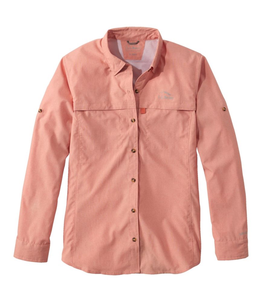 A customer favorite for 30 years, our Tropicwear sunblocking apparel is now even better - with a softer fabric, built-in stretch, a more comfortable fit and better venting. Slightly Fitted: Softly shapes the body. 71% nylon; 29% polyester. Machine wash and dry. Cape venting in front for extra air-flow. New vertical back caping works well with fishing packs. UPF 50+ fabric blocks at least 97. 5% of the sun's UV rays. Made with soft, lightweight polyester/nylon weave with comfortable built-in stretch. Tabs allow you to keep sleeves rolled up and in place even while casting. Includes larger front chest pockets for smaller necessities. Snap down points keep collar in place while using pack or on boat ride. Wrinkle-free fabric is ready to wear right out of the dryer. Sunglasses microfiber wipe on front shirt tail. Imported. Fit: Slightly Fitted Women's Tropicwear Shirt, Long-Sleeve Faded Orange Small, Synthetic/Nylon L.L.Bean