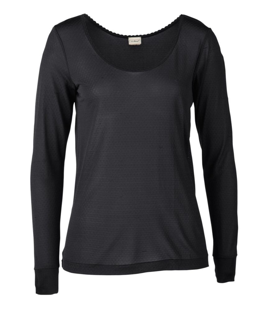 For when you need a bit more warmth, this silk long-sleeve scoop neck is weightless, layers without adding bulk and has a touch of the feminine in its soft pointelle-knit fabric. 100% pointelle-knit silk. Machine wash, dry flat. Imported. Fit: Relaxed Fit Women's Silk Pointelle, Long-Sleeve Scoopneck Black Medium L.L.Bean